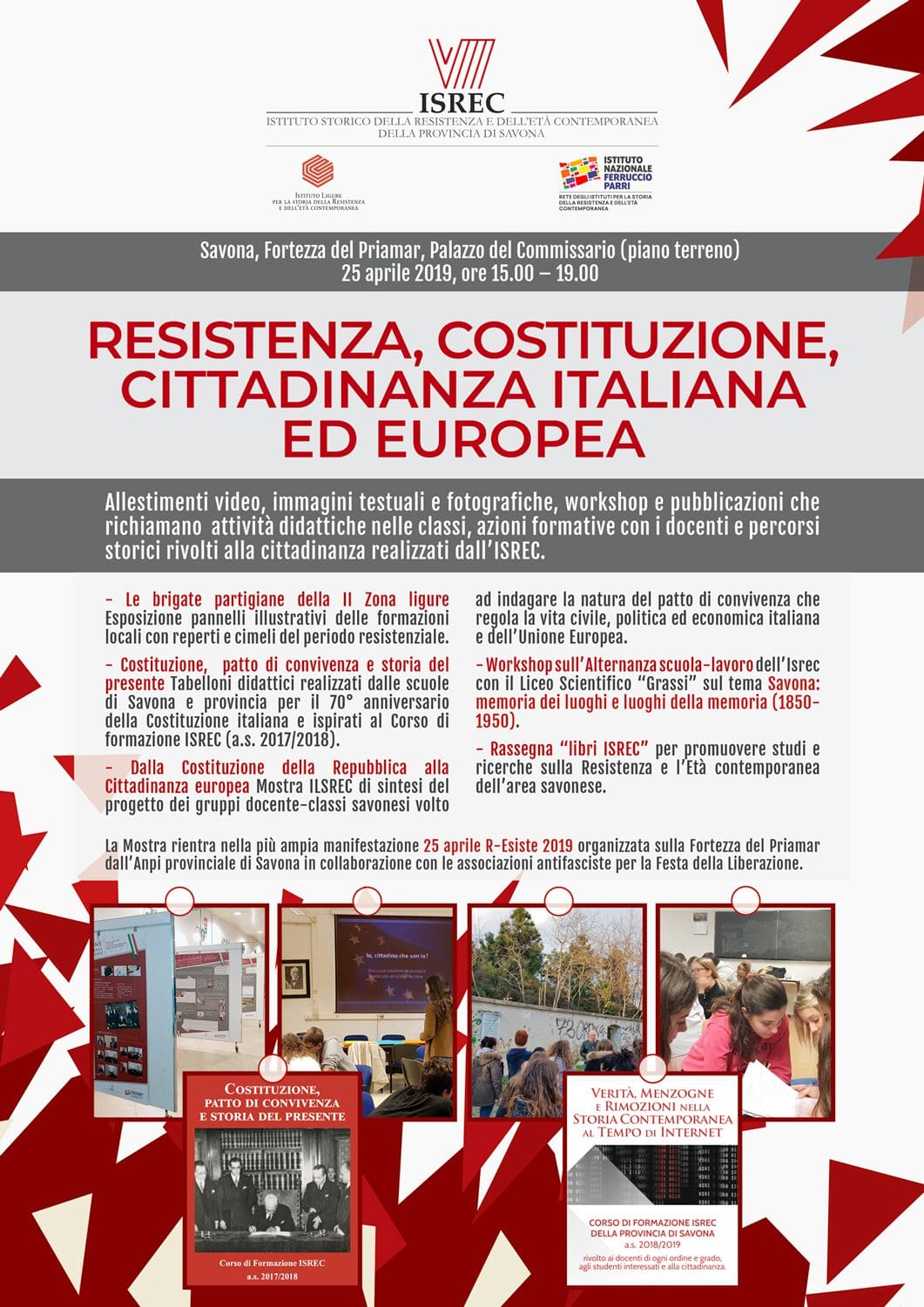Allestimento di 3 mostre realizzate dall’Isrec con il coinvolgimento delle scuole della provincia di Savona nell’a.s. 2018/2019 e Workshop sull’Alternanza scuola-Lavoro dell’Isrec con la classe 5ª C del Liceo scientifico “Grassi†di Savona.